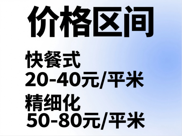 价格区间:快餐式20 - 40元/平米,精细化50 - 80元/平米